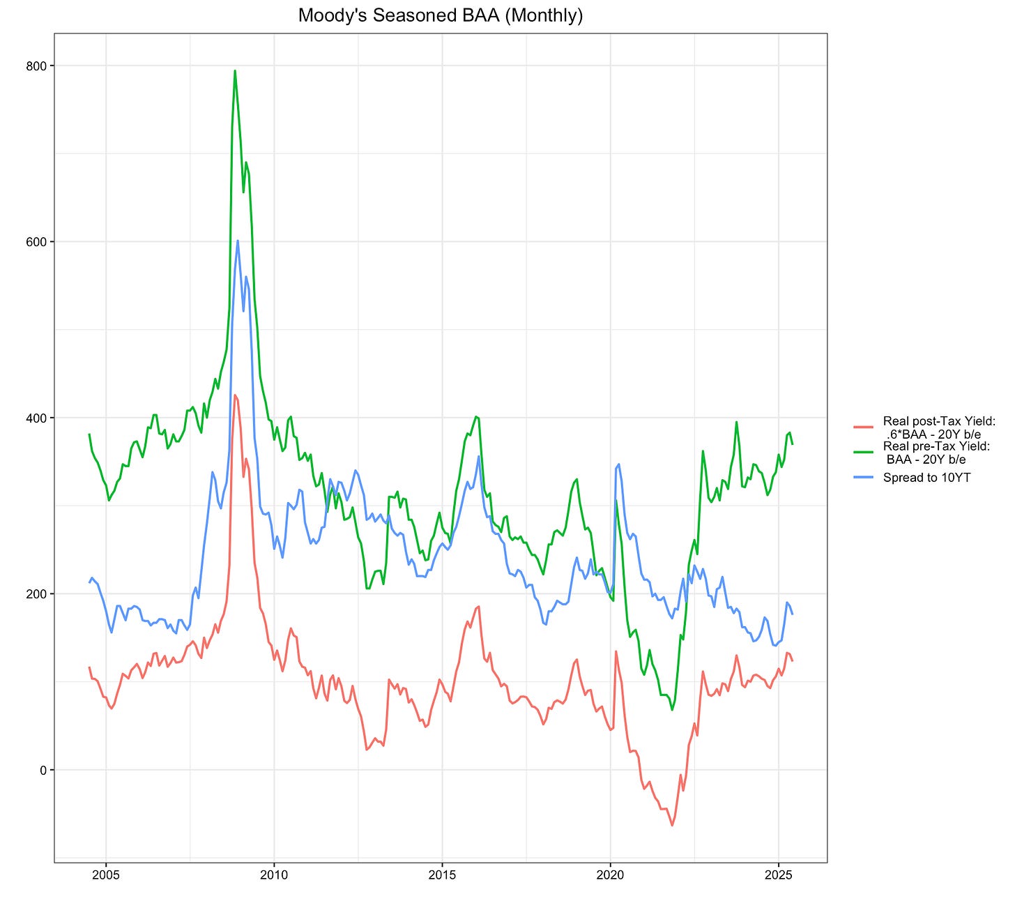 Spread to treasuries remains tight — the increase in the blue line at the end is just a duration mismatch as the yield curve steepens: As fascism intensifies, the lines between government and corporate credit risk blur. Meanwhile, compensation relative to inflation breakeven is testing a breakout. My read here is that risk from some potential AI losers (or other megatrends) are being priced in. Tough to interpret what’s going on here, but broadly speaking I think it’s fair to say bond investors are feeling antsier.
