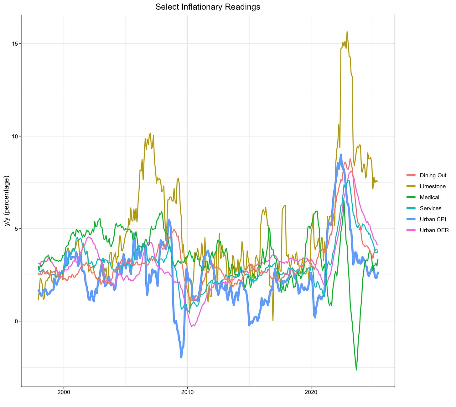 Crushed rocks remain king. Services and rent have cooled off fairly steadily, but recently services inflation is stuck well above the 2% target. Meanwhile, dining out has actually re-accelerated. In June’s data: